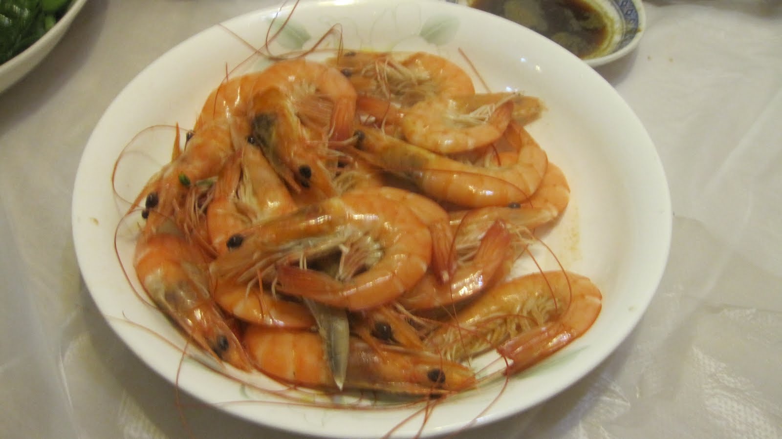Next came, well not really next as everything pretty much came at once, one of my favorites. A large plate of fresh steamed shrimp with a simple sauce made by adding scalding oil to a dish of soy, sugar and pepper. I love these little guys and would have happily eaten the whole plate of them. The family made fun of me for the way I ate them, leaving the shells, heads and appendages in tact, but let me say loud and proud that my way is better! The shells add a nice little crunch, I'm sure it's good for your skin or something and by not peeling every single one you can stuff you gullet more efficiently.